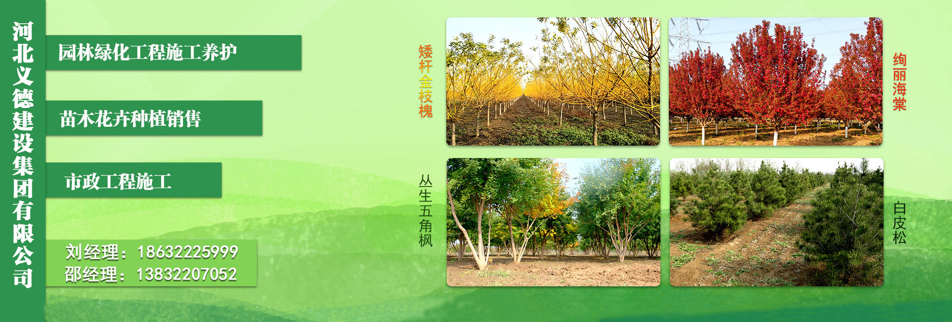 我公司經濟技術力量雄厚,設備齊全,管理規范,擁有專業的苗木培育和管護隊伍,園林植物種類、規格齊全、苗木花卉質量上乘,為不同類型、不同季節施工的園林工程施工創造了必要條件。公司發展至今安國、蠡縣、石家莊、北京等地建立苗木基地達到8000多畝,苗木基地現有園林綠化苗木120余種,現可銷售喬灌木達100萬余株,主要銷售地區為京津冀地區,形成了具有特色的精品苗木產業。